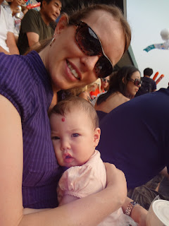today was actually not lilyanna's first game. we went to some games last season and this is a photo from the game we were at on the day bafore lilyanna started to make her entrance into the world. i figure she wanted to come out and see what all that excitement was all about, so today she saw with her own eyes! i look pretty tired there in the background. nothing says "the day before going into labour" quite like this photo of me! (it's a much better photo of our friends lucy and kevin!)